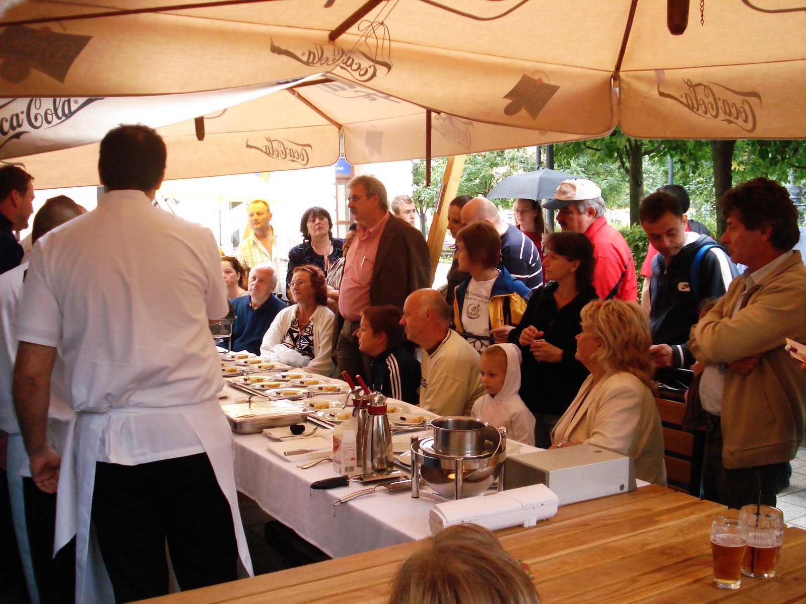 Az idegesítően szemerkélő eső elállni látszott, ezért a következő étterem a Gusta előtt állította fel "ízlelő portáját". Asztalokat húztak össze, makulátlan fehér terítők lebbentek, széles karimájú tányérok, szifonok, elektromos sütőlapok sorakoztak katonás rendben a Hunguest Hotel Aqua-Sol séfjeinek keze nyomán. Sejtettük, hogy valami különleges készül, a párás levegő megtelt izgatottsággal, az emberek körülfogták a rögtönzött konyhát és kíváncsian figyelték a molekuláris gasztronómiai varázslatot, hogyan lesz egy egyszerű tejfölből felhő állagú habrózsa, hogyan serceg a véres bélszín az edényben - és hogyan zárják a marharagú szaftját önmaga burkába, mintha egy barna üveggolyó lenne, ami a szádban ízek milliárdjaira pukkan szét. Az apró, tégla formára vágott hagymás-kolbászos kenyér nem hasonlított a hagyományos kenyérre sem állagban, sem kinézetben. Fűszeres kolbászdarabokkal, hagymával ízesített ruganyos, sárga színű kenyérszelet volt, ami tökéletesen egészítette ki a félig átsütött bélszínt.
